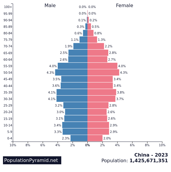 When you compare population pyramids from different countries, you can see differences that translate into real economic and cultural effects. Here, for example, is China.